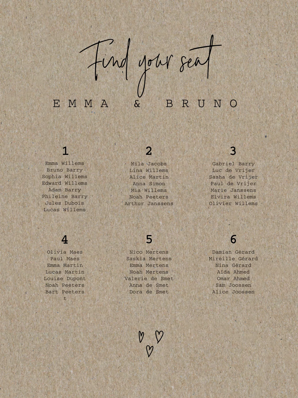 Poster in kraftlook met de tafelschikking in moderne zwarte tekst. De posters worden gedrukt op stevig, glad papier (Silk MC 250 g/m²). De poster kan niet op zichzelf staan, maar moet worden ingelijst of bevestigd met bijvoorbeeld plakband.