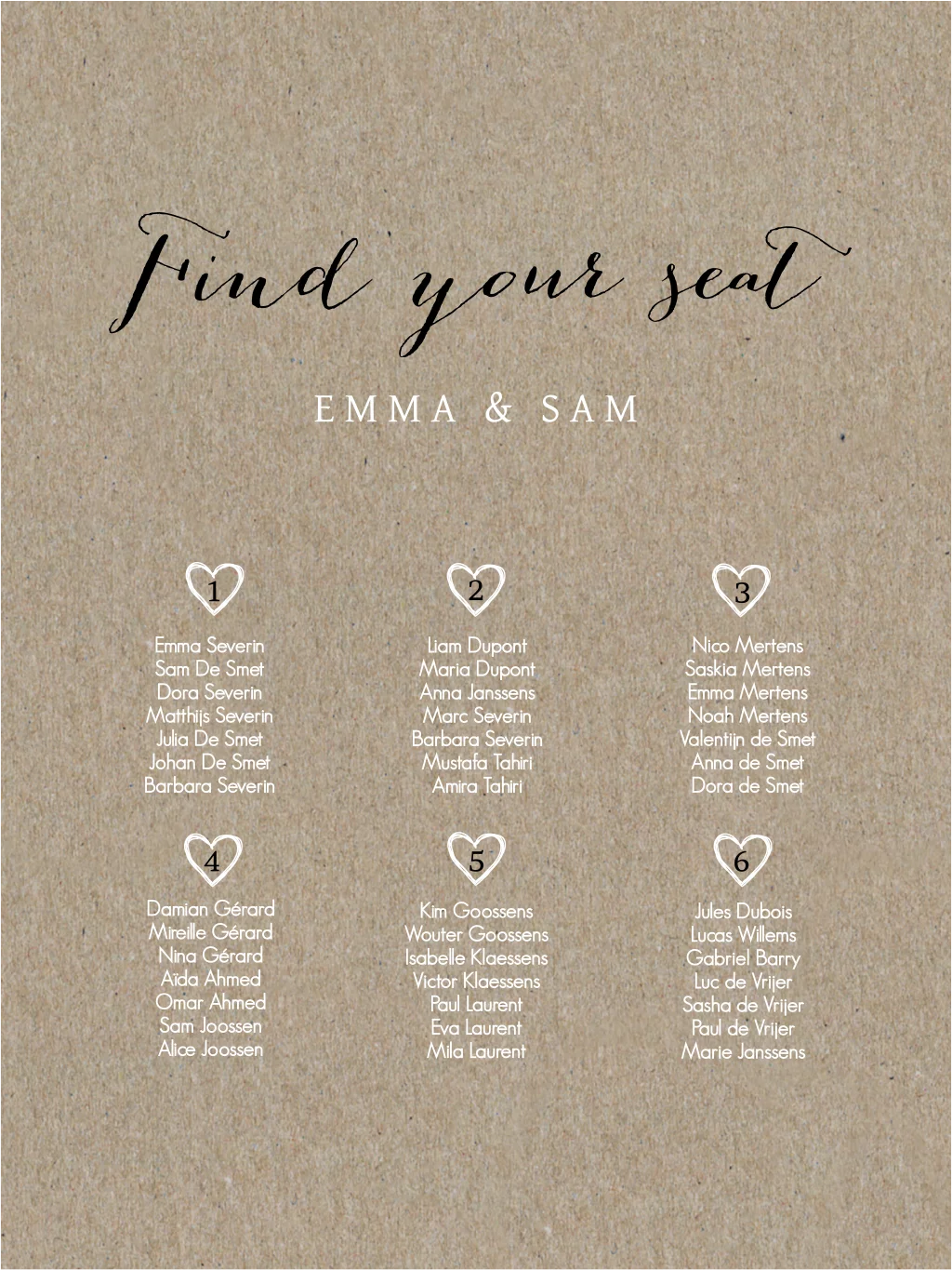 Poster in kraftlook met de tafelschikking in witte tekst met hartjes erboven. De posters worden gedrukt op stevig, glad papier (Silk MC 250 g/m²). De poster kan niet op zichzelf staan, maar moet worden ingelijst of bevestigd met bijvoorbeeld plakband.