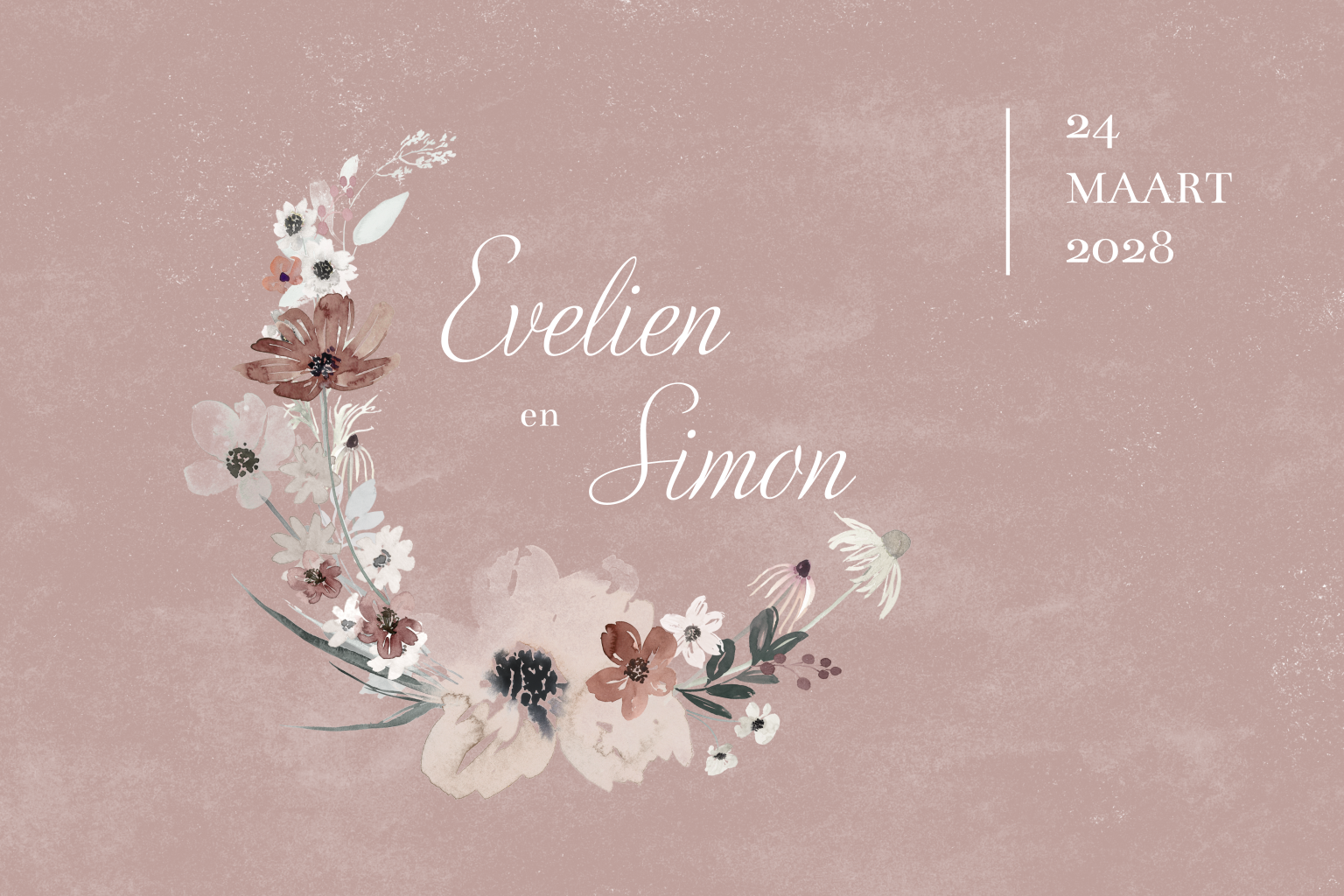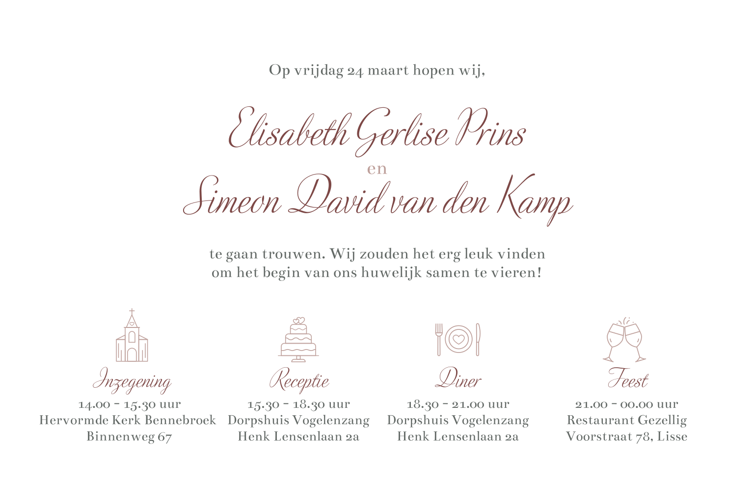 Een trouwkaart met mooie bloemen en het programma met icoontjes. In de beeldbank vind je mappen met meer icoontjes zodatj e deze altijd passend bij jullie dagprogramma kunt maken.
