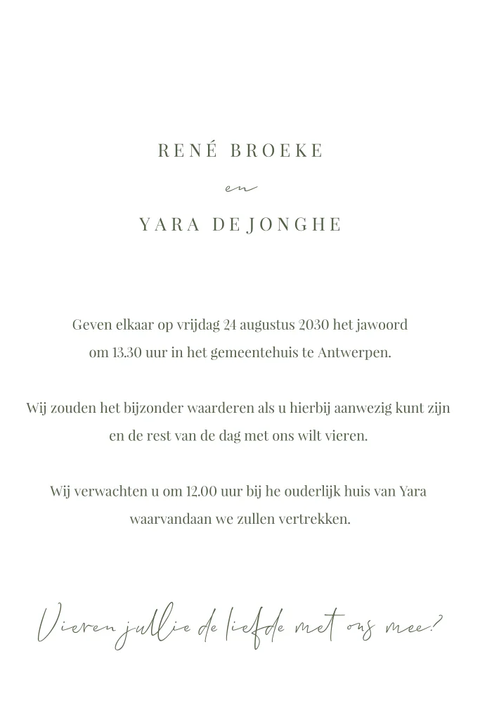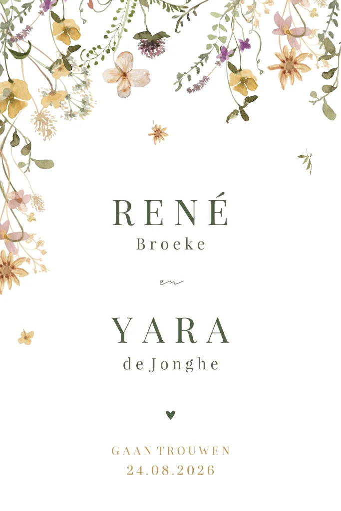 Wat een romantische trouwkaart! Aan de bovenzijde een mooie rand van bloemen in verschillende kleuren. De tekst is in een modern lettertype in bijpassende kleur, eronder een lief hartje. In de online editor maak je de kaart persoonlijk en voeg je eenvoudig eigen teksten toe.