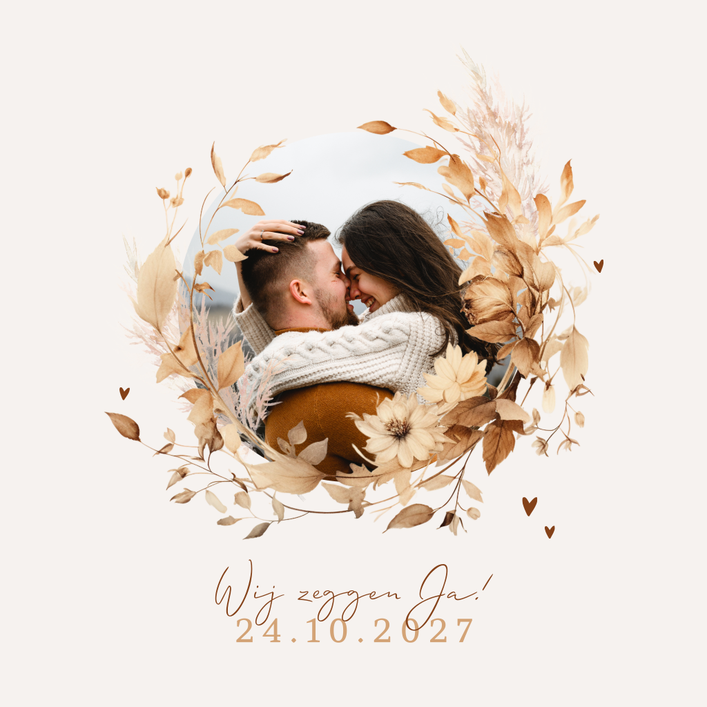 Stijlvolle trouwkaart in zacht roze pastelkleur, in de krans van droogbloemen kun je een eigen foto uploaden. De kleine hartjes er omheen maken het compleet, love is in the air!