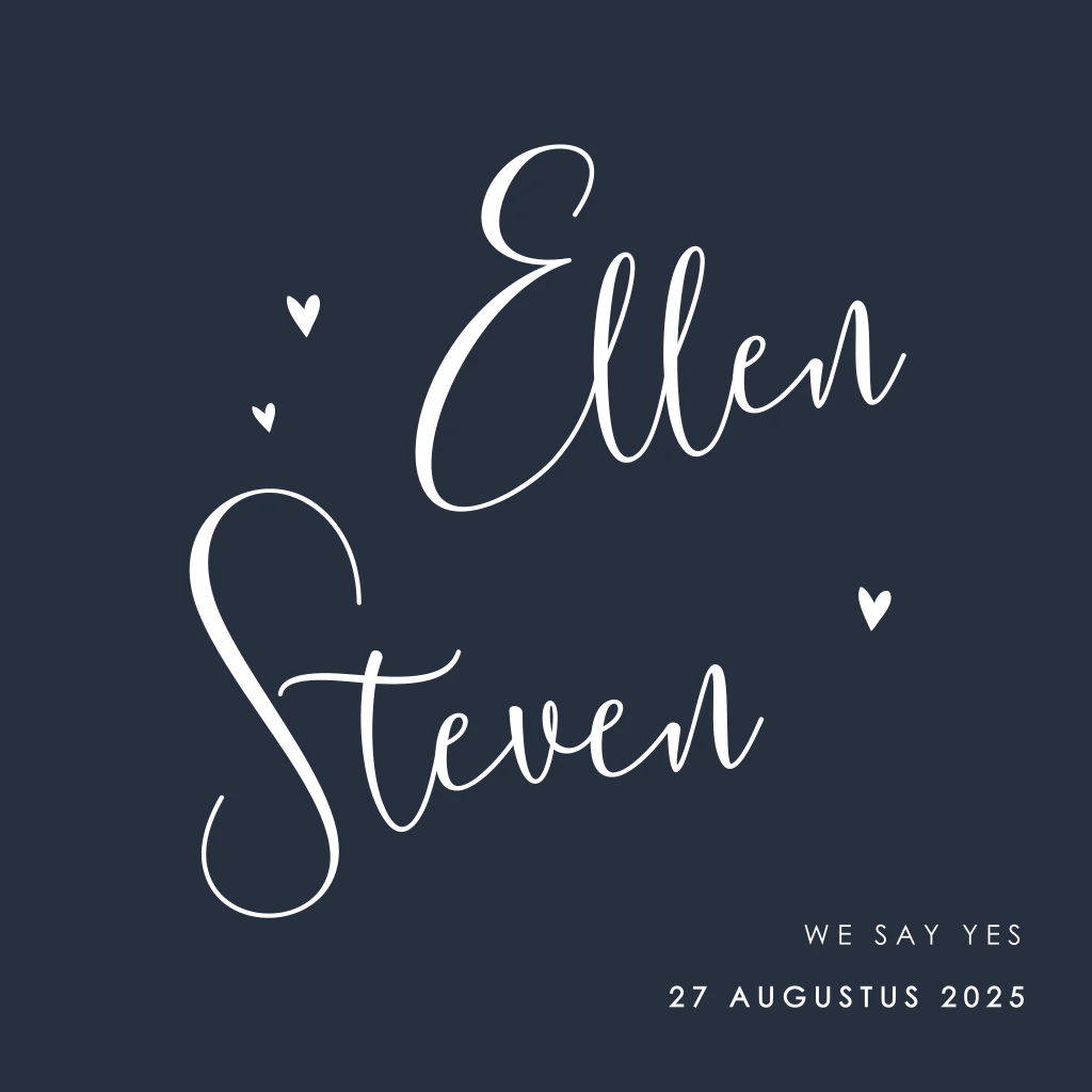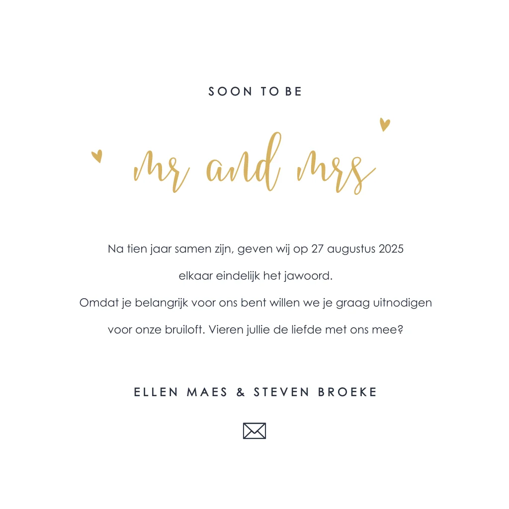 Een vierkante trouwkaart met goudfolie, wat zorgt voor een chique uitstraling. Wil je toch wat veranderen, dat kan! Personaliseer het kaartje volledig naar eigen wens in de online editor.