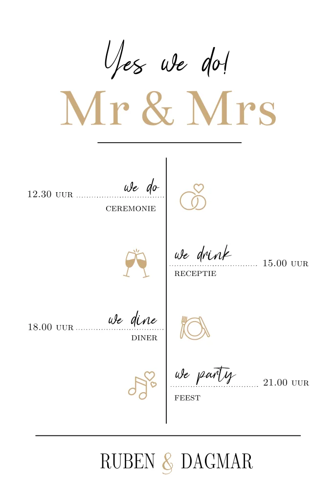 Classy trouwkaart met een chique Mr & Mrs in goudkleur, heel stijlvol! Op de voorzijde staat het programma voor deze bijzondere dag, met leuke symbolen erbij als illustratie. Op de achterkant kun je de tekst van de uitnodiging plaatsen, pas het zelf aan in de online editor.