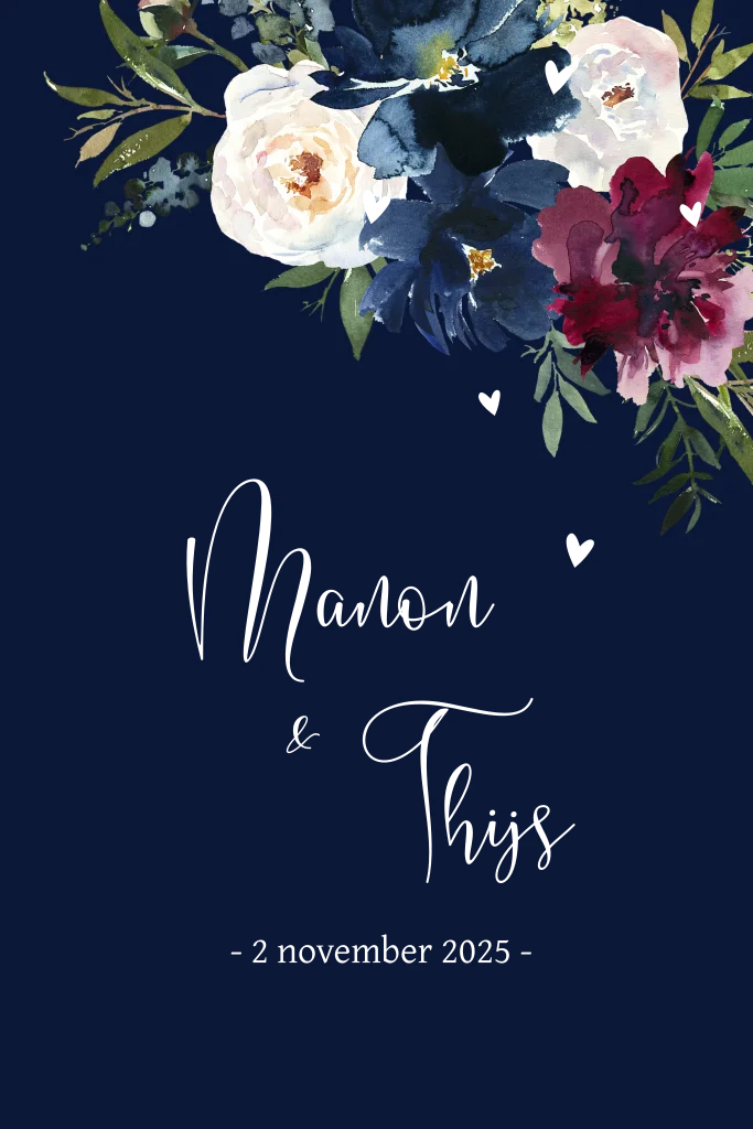 Stijlvolle donkerblauwe trouwkaart met geschilderde bloemen, de namen staan in goudfolie waardoor de kaart een chique uitstraling krijgt.