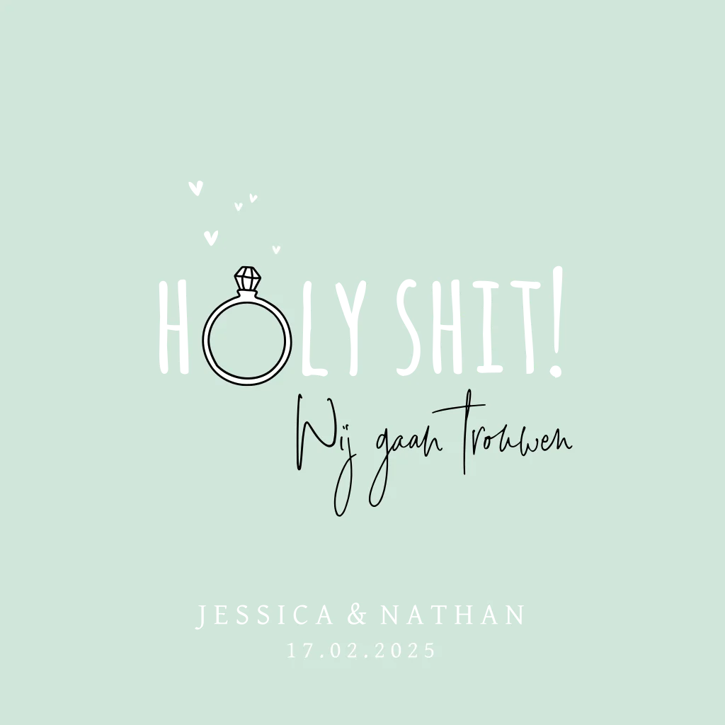 Holy shit! Wij gaan trouwen! staat op dit hippe kaartje. De O van Holy shit ziet eruit als een trouwring, dat geeft een extra grappig effect. De tekst wordt in goudfolie gedrukt dat zorgt voor een chique effect. In combinatie met de mintgroene achtergrond kleur krijgt de kaart een hele trendy look. In de online editor voeg je eenvoudig je eigen teksten toe en maak je de kaart persoonlijk.