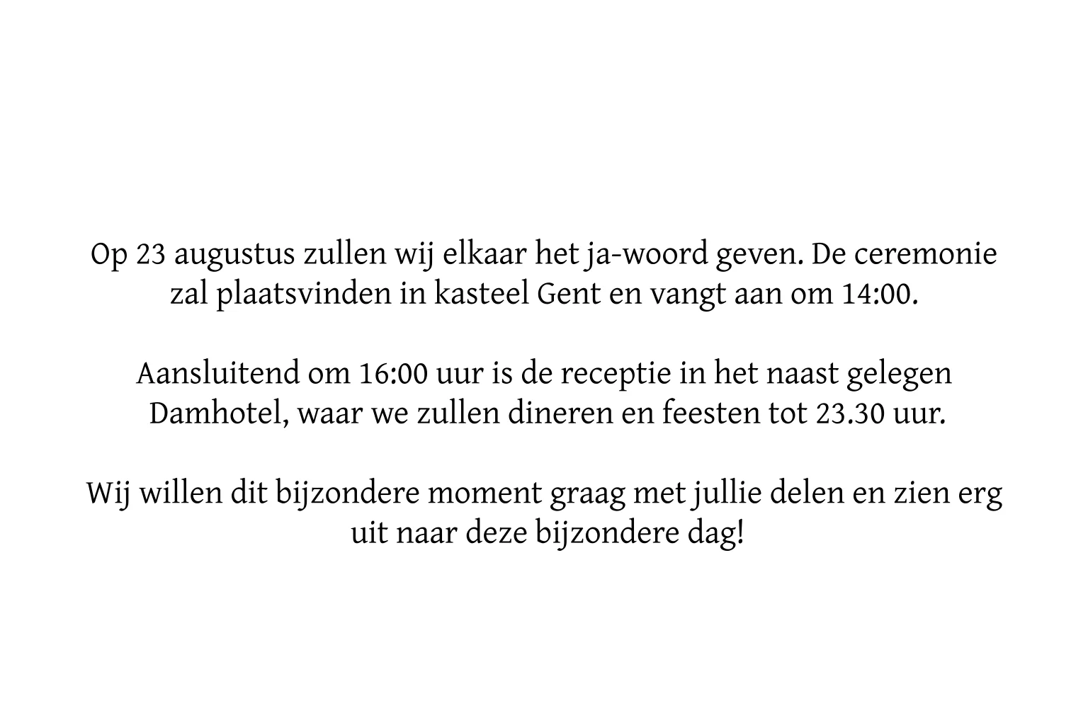 Stijlvolle save the date kaart met ruimte voor een mooie foto van het aankomende bruidspaar. Naast de foto staat groot JA! Dit wordt in een goudfolie gedrukt, hierdoor krijgt de kaart een extra chique look. Je kunt ook kiezen voor een andere kleur folie, denk eens aan een zilver- of koperkleur!