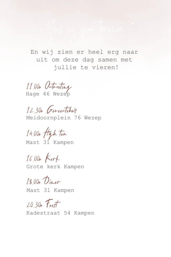 Deze trouwkaart met sterren en maan in goudfolie kun je zelf aanpassen naar wens tot een stijlvol geheel. Het goudfolie kun je omzetten naar een ander soort folie. Ook de roestbruin rode achtergrond kun je aanpassen.