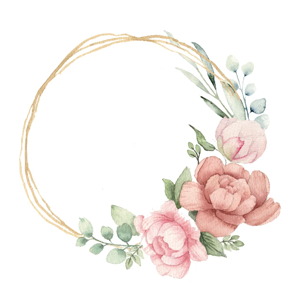 Romantische trouwkaart met handgeschilderd bloemenkrans van roze pioenrozen en eucalyptustakjes in aquarel. De namen staan in sierlijk lettertype in feestelijke goudfolie, ook op de achterzijde, waar leuke bijpassende icoontjes staan bij het dagprogramma.