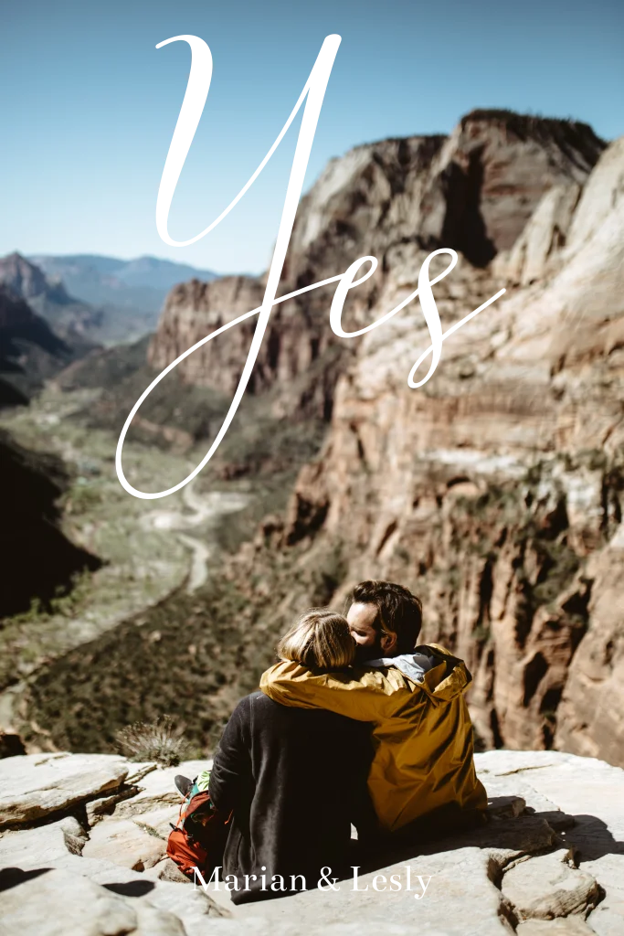 Moderne huwelijksuitnodiging met foto en yes in goudfolie