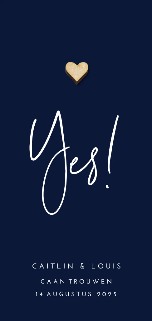 Donkerblauwe trouwkaart met houten hartje en moderne typografie. Het houten vormpje op dit kaartje wordt niet mee gedrukt, deze is ter voorbeeld. Op die plek kun je straks zelf het échte houten vormpje plakken.