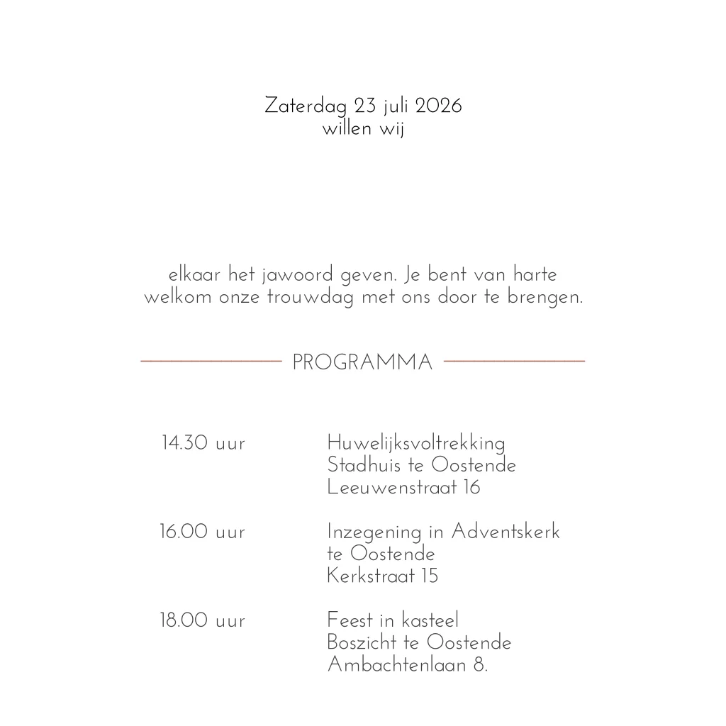 Stijlvolle trouwkaart in bruine velvetlook gecombineerd met luxe goudfoliedruk. Op de voorkant staan de namen van het bruidspaar in wit in een hexagoon van goudfolie met hartjes erboven. Het design met goudfolie en hartjes komt terug op de witte binnenkant van de kaart.
