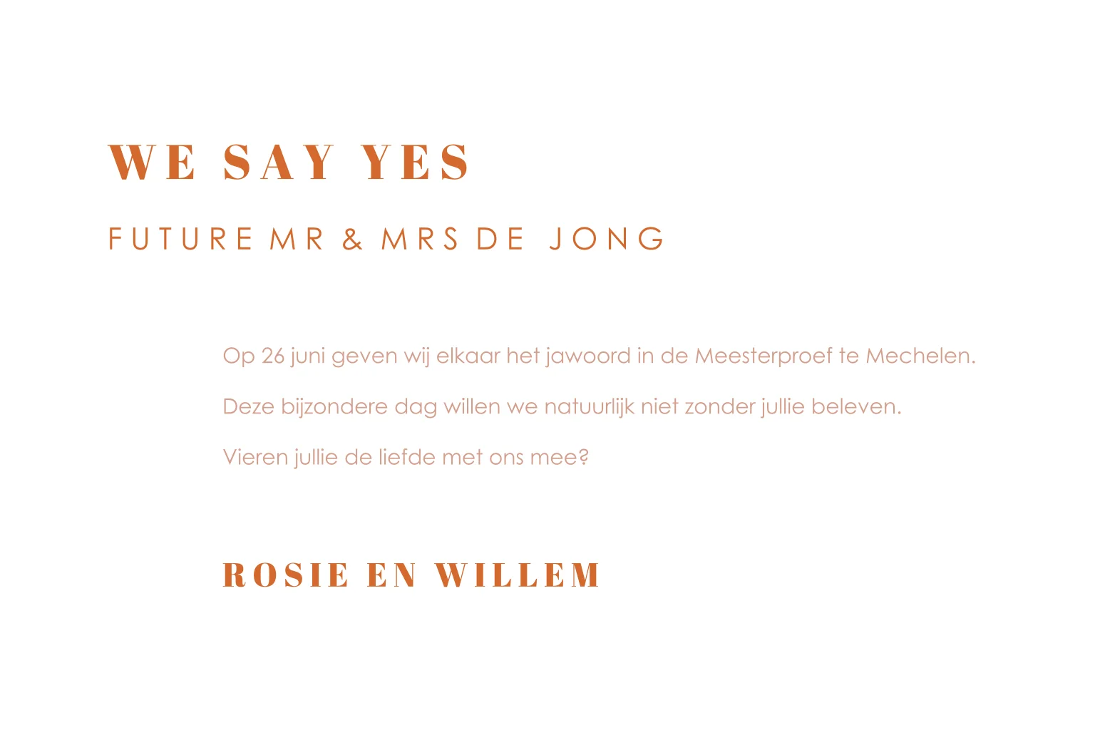 Maak jullie trouwkaart persoonlijk met een foto, upload een leuke foto op de voorkant en pas de teksten aan in de online editor. Een deel van de tekst staat in roze, mooi effect op deze eenvoudige trouwkaart!