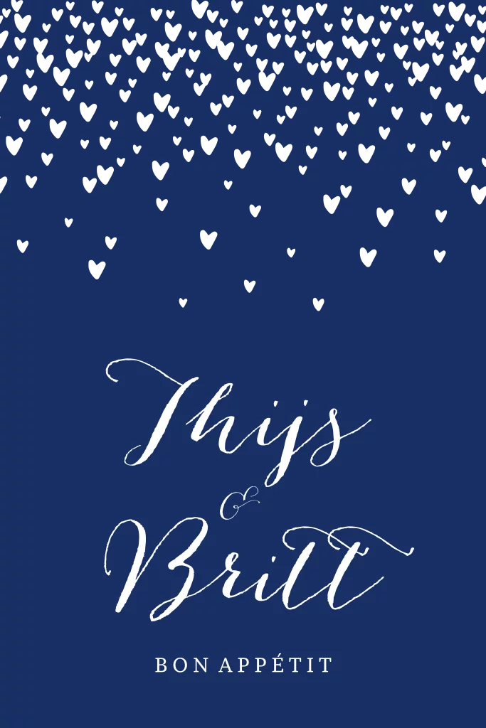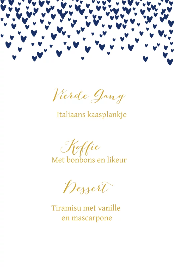 Stijlvolle menukaart met goudfolie hartjes op een donkerblauwe achtergrond. De hartjes staan aan de binnenkant in het donkerblauw. Kleuren en lettertypes kunnen worden aangepast.