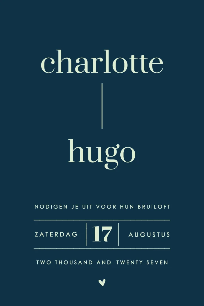 Moderne huwelijksuitnodiging in donkerblauw met afgeronde hoeken. De tekst op de blauwe achtergrond is mintgroen, de achterkant van de kaart is wit met donkerblauwe tekst. Het kleine hartje onder de tekst maakt het compleet, tijd om de liefde te vieren!