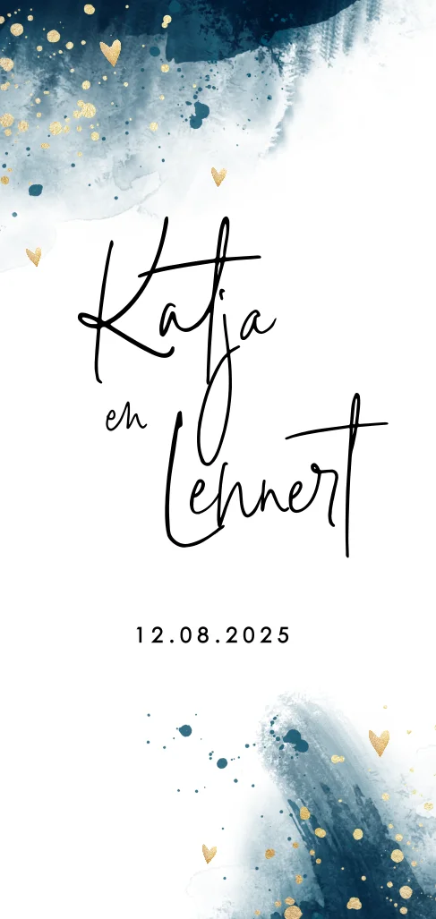 Een langwerpige trouwkaart met donkerblauwe waterverf. Spetters en kleine hartjes hebben een goudachtige kleur. Personaliseer het kaartje in de editor volledig naar eigen wens.