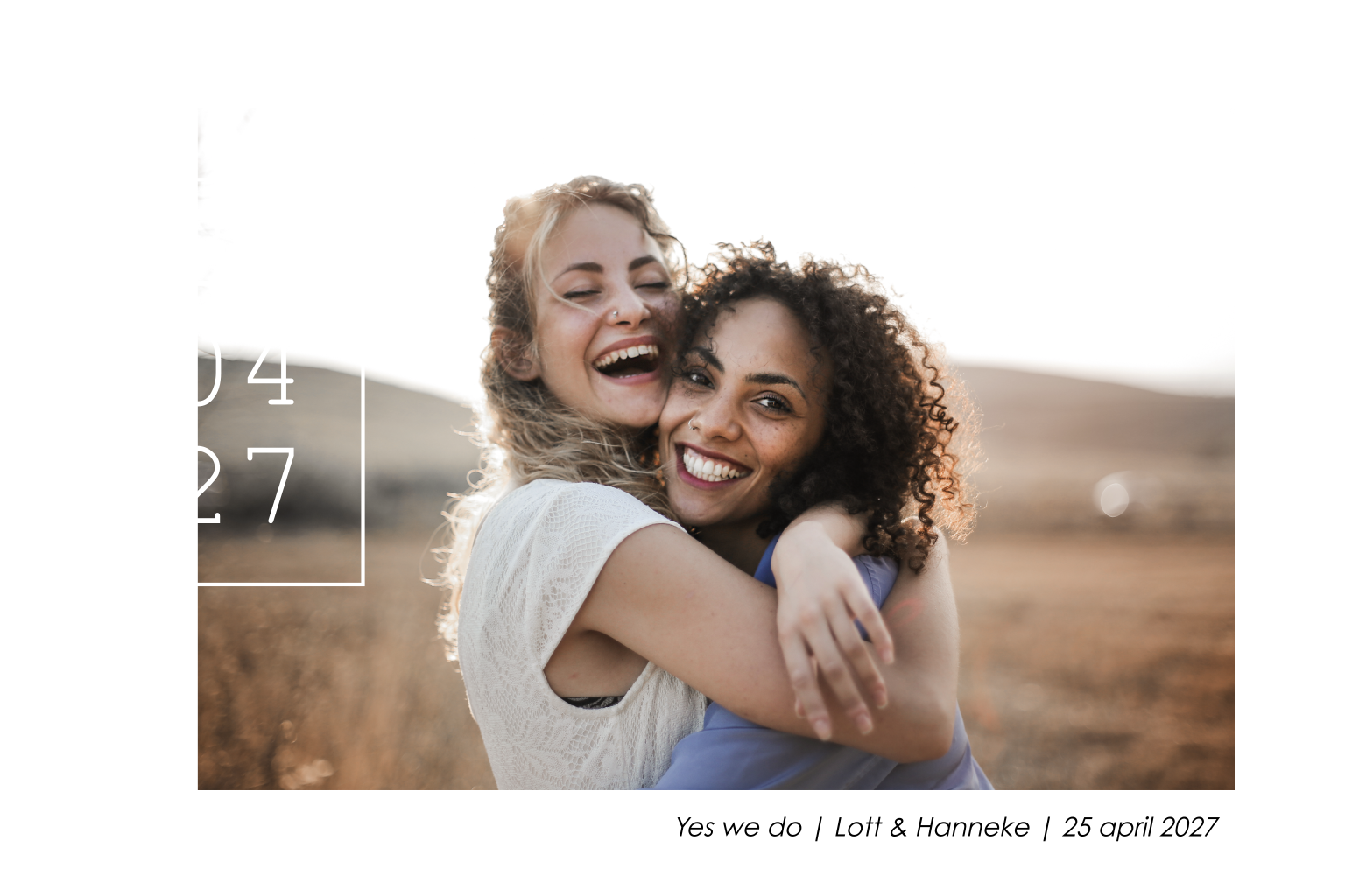 Hippe witte trouwkaart met ruimte om een eigen foto toe te voegen op de voorzijde. Naast de foto staat de datum in goudfoliedruk, chic! Ook aan de binnenzijde komt de goudfolie terug in de tekst en de icoontjes.