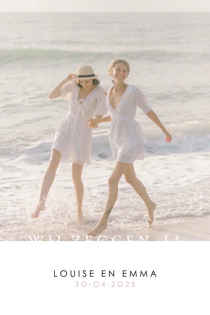 Trendy trouwkaart met ruimte voor een romantische foto op de voorkant. De tekst staat voor een deel in roségoudfolie, dat geeft een extra luxe accent! De achterzijde is verdeeld in wit met een roze vlak onderaan, hierboven kan de tekst van de uitnodiging worden geplaatst. Liever andere kleuren of letters gebruiken? Maak de kaart helemaal naar persoonlijke wens in de online editor!