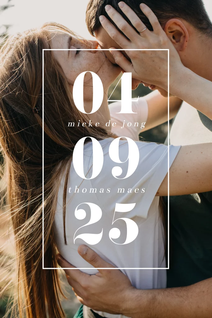 Hippe witte trouwkaart met ruimte voor een eigen foto op de voorkant, over de foto staat de datum in grote witte letters. Op de achterzijde staat in hetzelfde lettertype in zwart 'yes we do', maak de kaart persoonlijk in de online editor en bestel een proefdruk.