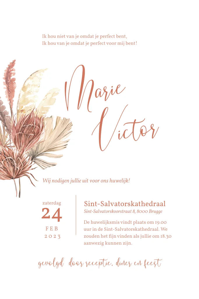Stijlvolle trouwkaart met droogbloemen en rood/roze tekst op voor- en achterkant. Jullie namen in een prachtig stijlvol lettertype zorgen voor een mooi geheel.