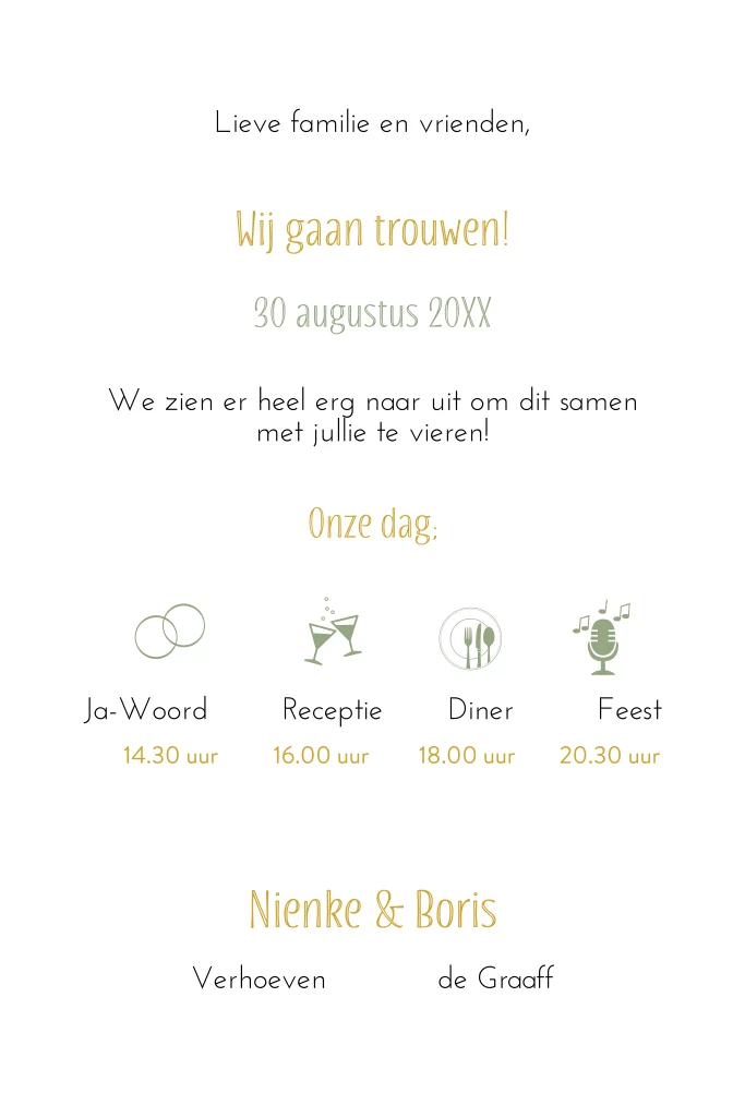 Een sjieke trouwkaart met een art deco kader en jullie namen gedrukt in goudfolie en twee mooie waterverf takjes op de achtergrond. Deze kaart kun je eenvoudig zelf aanpassen.