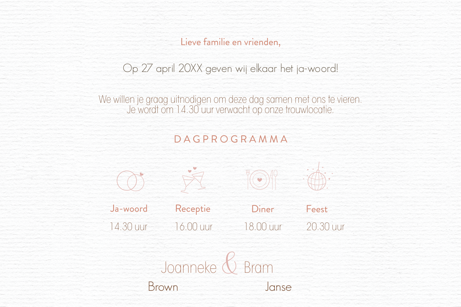 Een dubbele liggende trouwkaart met hand getekende bloemen in roze en bruine tinten en een structuur achtergrond die je eenvoudig zelf kunt verwijderen.