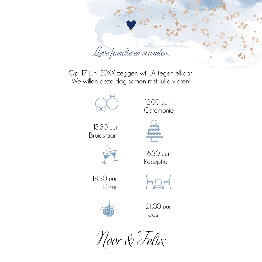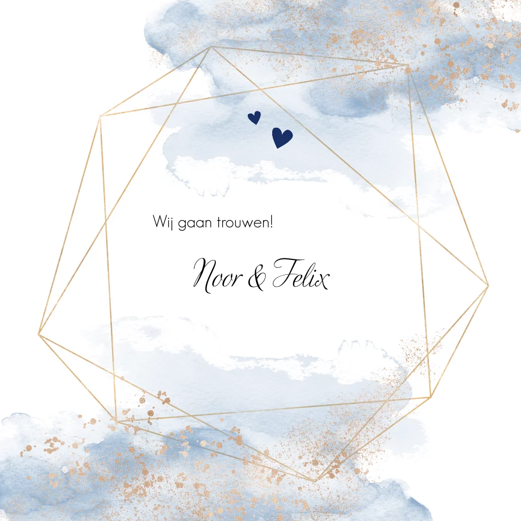 Stijlvolle trouwkaart met blauwe aquarelvlakken en goudkleurige confetti. In de goudkleurige geometrische vormen staan de namen van het bruidspaar in sierlijke letters in bijpassend blauw met romantische hartjes erboven. Aan de binnenzijde kun je een eigen foto toevoegen, pas de kaart naar wens aan in de online editor.
