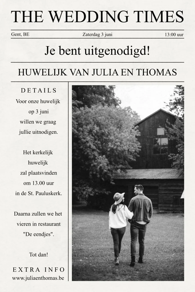Groot nieuws, jullie gaan trouwen! Met deze originele kaart in de stijl van een krant nodig je de gasten voor jullie feest uit. De kaart is geheel in zwart wit en op de voor- en de achterkant is ruimte voor een eigen foto. Er is gebruik gemaakt van verschillende lettertypes, in de online editor maak je de kaart persoonlijk en kun je de teksten aanpassen.