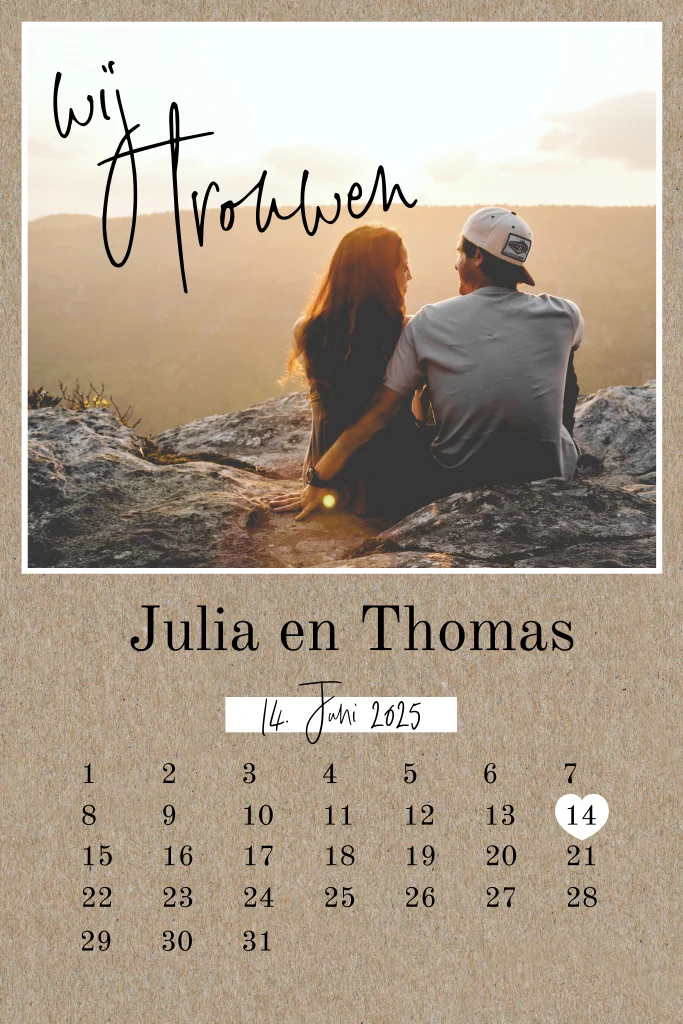 Originele trouwkaart op kraft-look, staand model. Ruimte voor eigen foto met daaronder een kalender met wit hartje op de trouwdatum. Personaliseer jullie kaart in de online editor.