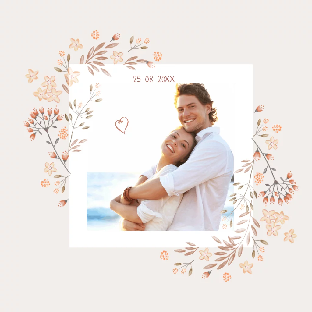Romantische trouwkaart met een foto, bloemetjes en takjes