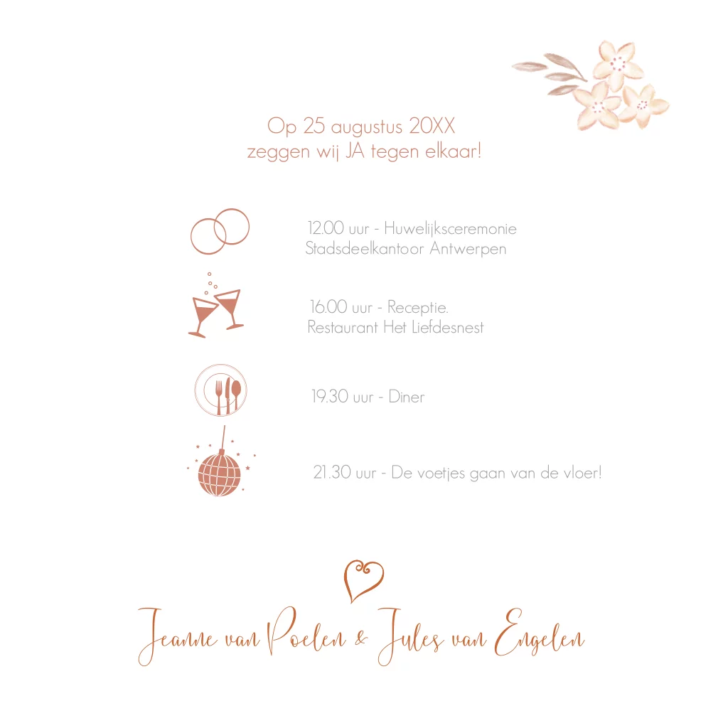 Romantische vierkante trouwkaart in pastelkleur met ruimte voor jullie leukste foto. Langs de foto mooie takjes in pastelkleuren. De achterzijde van de kaart is in dezelfde pastelkleur met een patroon van takjes, met in het midden weer jullie namen en trouwringen. Het ontwerp is eenvoudig helemaal naar eigen wens aan te passen in de online editor.