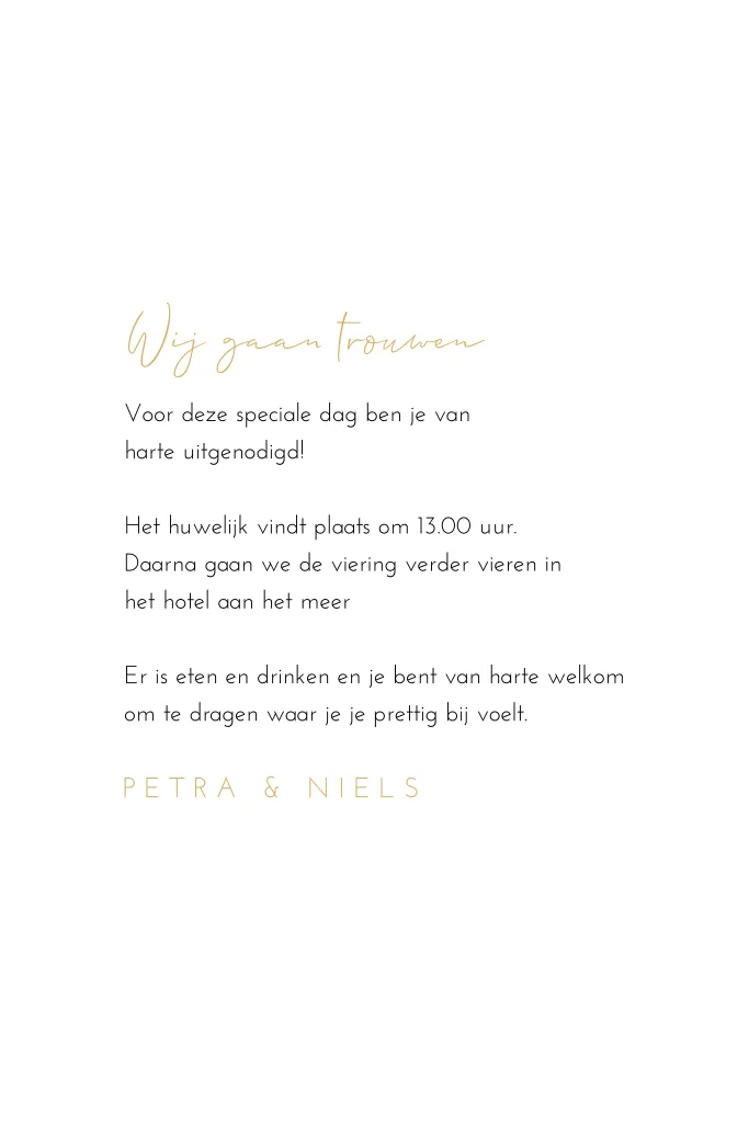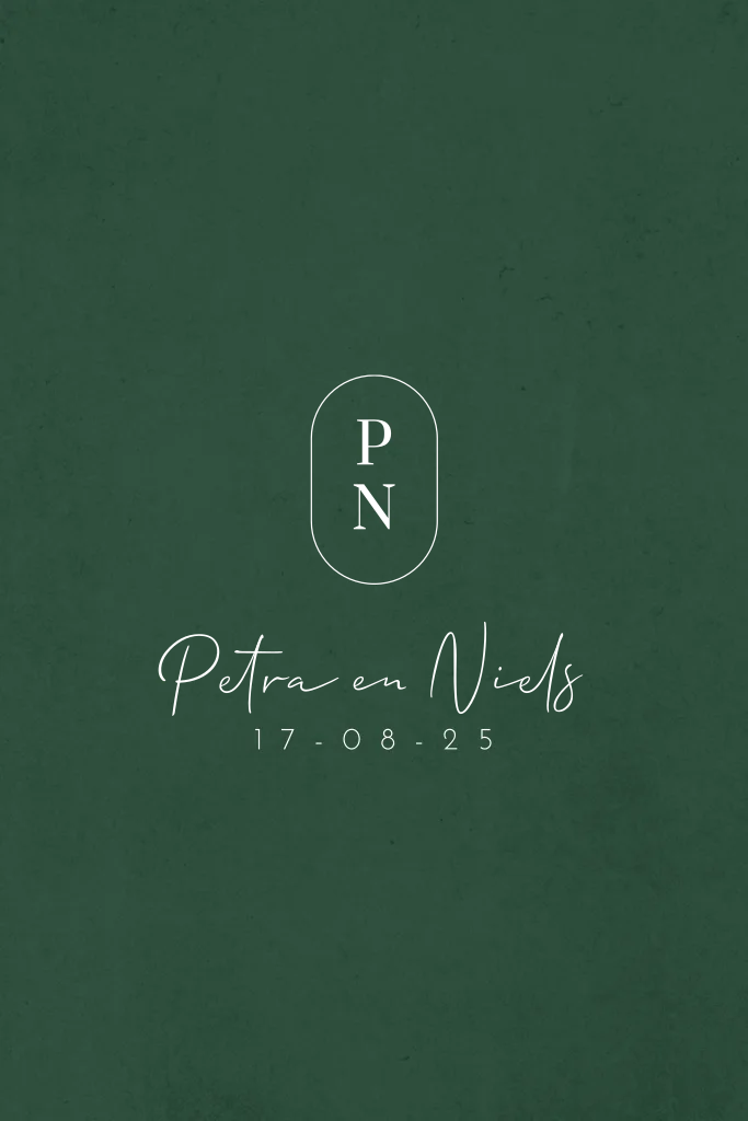 Minimalistische trouwkaart in chique donkergroen, de rechter binnenkant is wit. Voorop staan de initialen en de namen van het bruidspaar in goudfolie druk, dat zorgt voor een luxe accent. Aan de binnenzijde is plaats voor de tekst van de uitnodiging, deze staat in verschillende lettertypes en kleuren, dit kun je naar wens aanpassen in de online editor. Het kleine hartje op de linkerpagina en de achterkant maken de kaart af, romantisch!