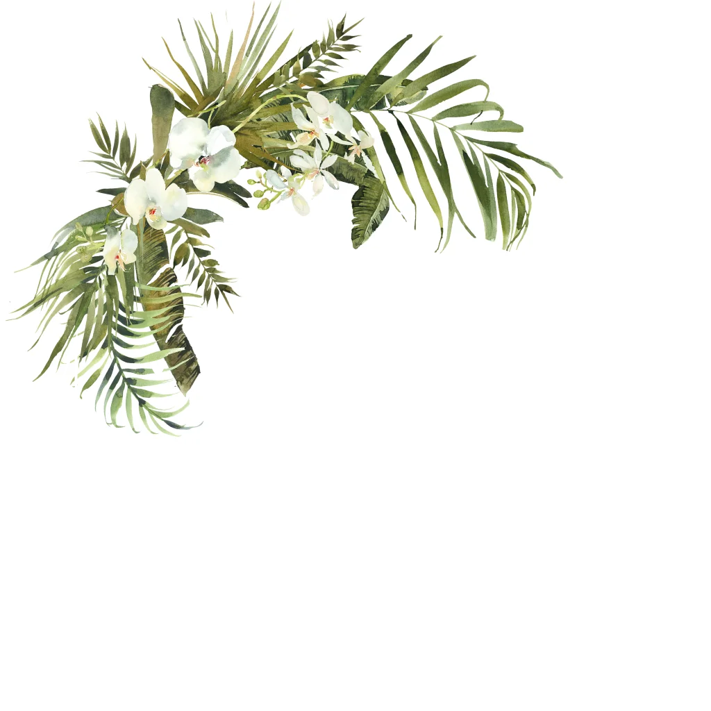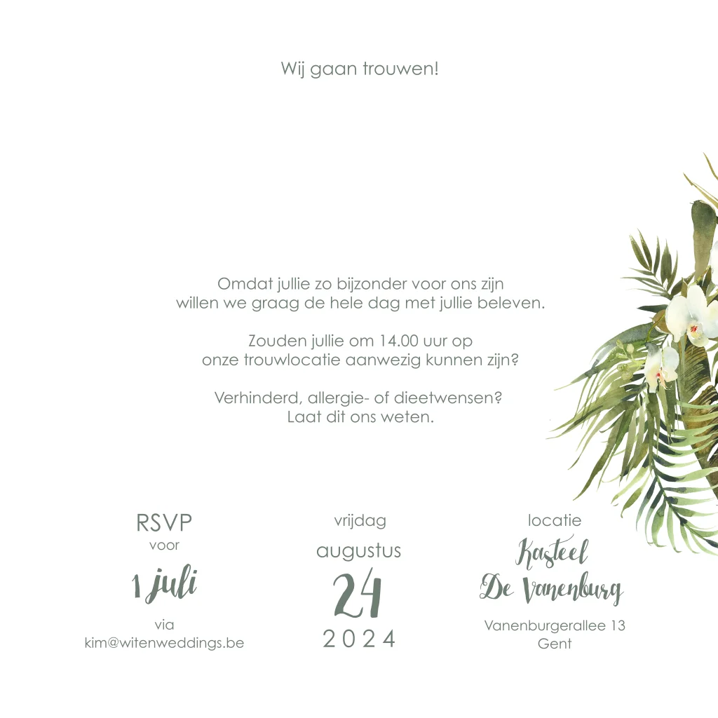 Stijlvolle trouwkaart met orchidee, geometrische lijnen en mooie typografie in goudfolie.