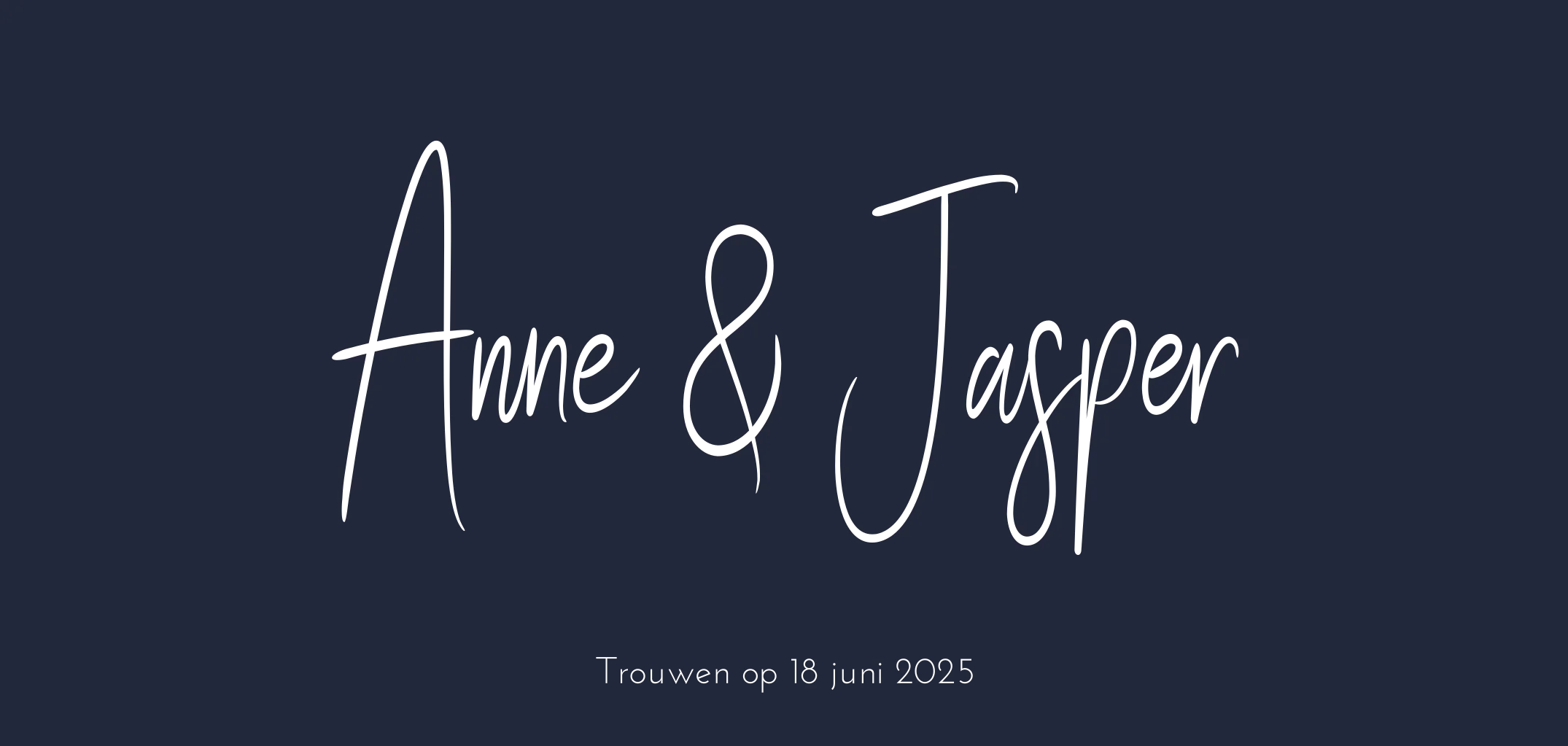Hippe trouwkaart met goudfolie namen op een donkerblauwe achtergrond. Je kunt ook kiezen voor een rosé-, koper- of zilverfolie. Dit pas je eenvoudig zelf aan in de online editor. Mooi voor als je van een stijlvolle bruiloft houdt.