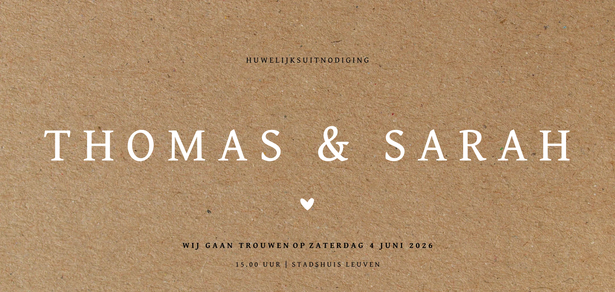 Een minimalistische trouwkaart, daardoor gaat alle aandacht naar de tekst van de uitnodiging. Op deze stoere kaart in panoramamodel staat de tekst in trendy zwarte letters, de namen staan centraal en springen er meteen uit. Het kleine hartje eronder zorgt voor een romantisch accent. Pas de tekst eenvoudig zelf aan in de editor, zo gedaan!