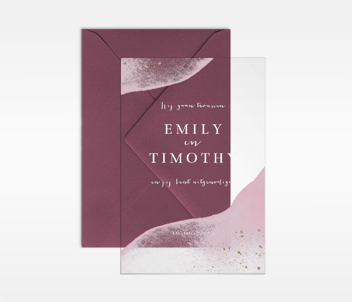 Trouwkaart van acrylglas met roze watercolour en gouden spetters