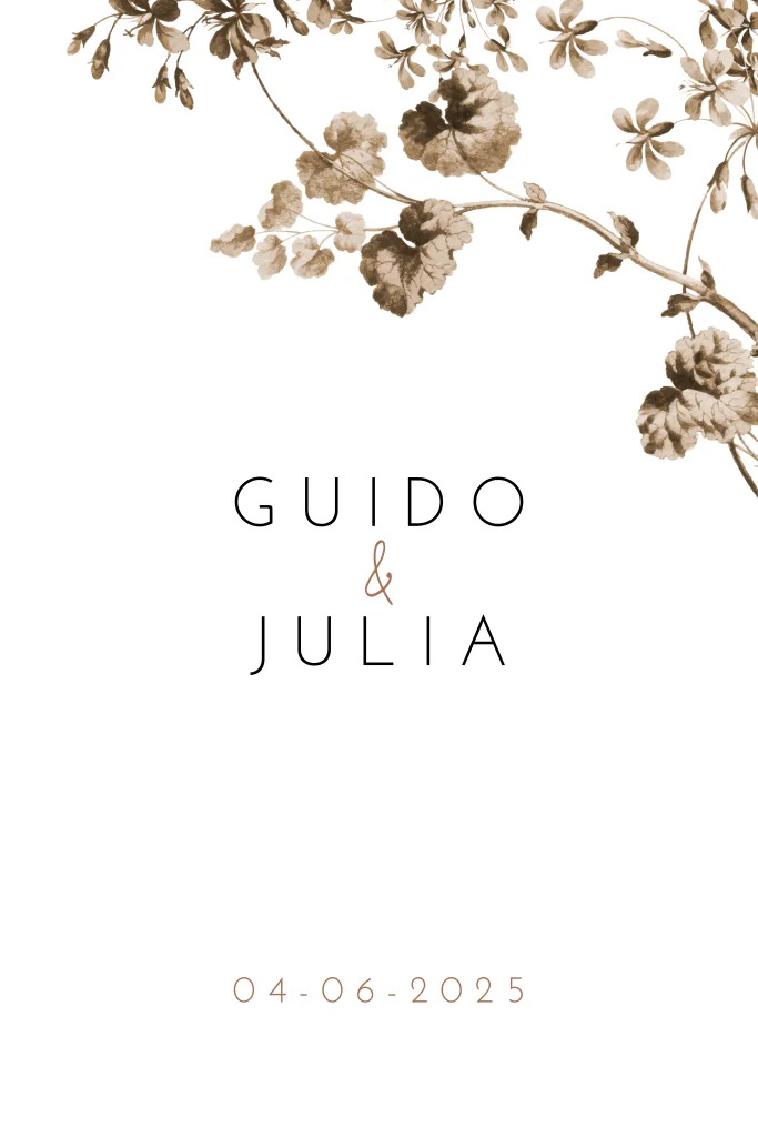 Stijlvolle trouwkaart in rustige kleuren. Op de witte kaart staat een getekende tak in beige en bruin met bloemen, op de achterkant komt de tak weer terug. De kaart heeft afgeronde hoeken en moderne typografie, pas deze eenvoudig zelf aan naar wens in de online editor.