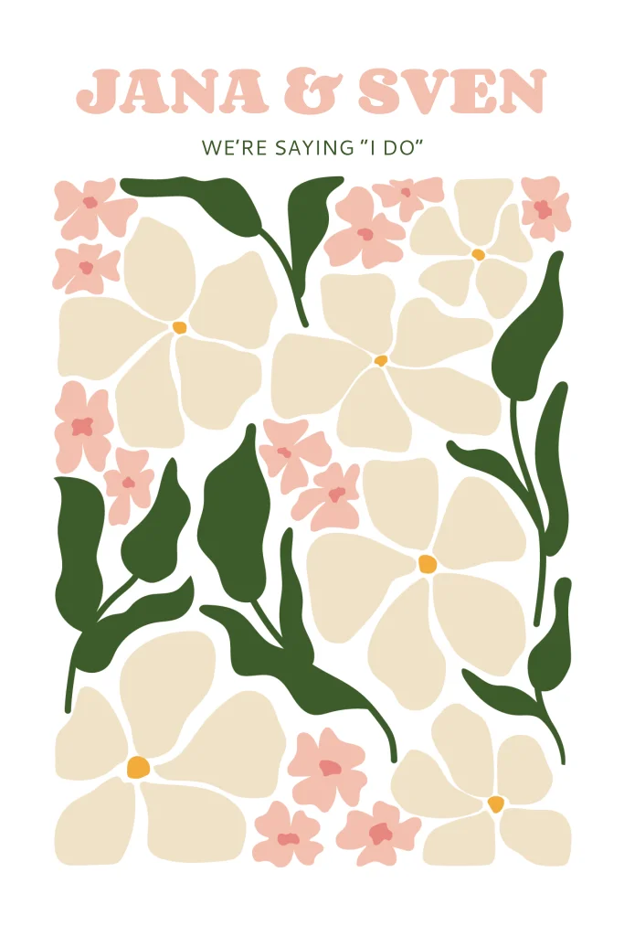 Hippe trouwkaart met een bloemenpatroon in pastelkleuren en stoere typografie, pas de kaart naar wens aan in de online editor.