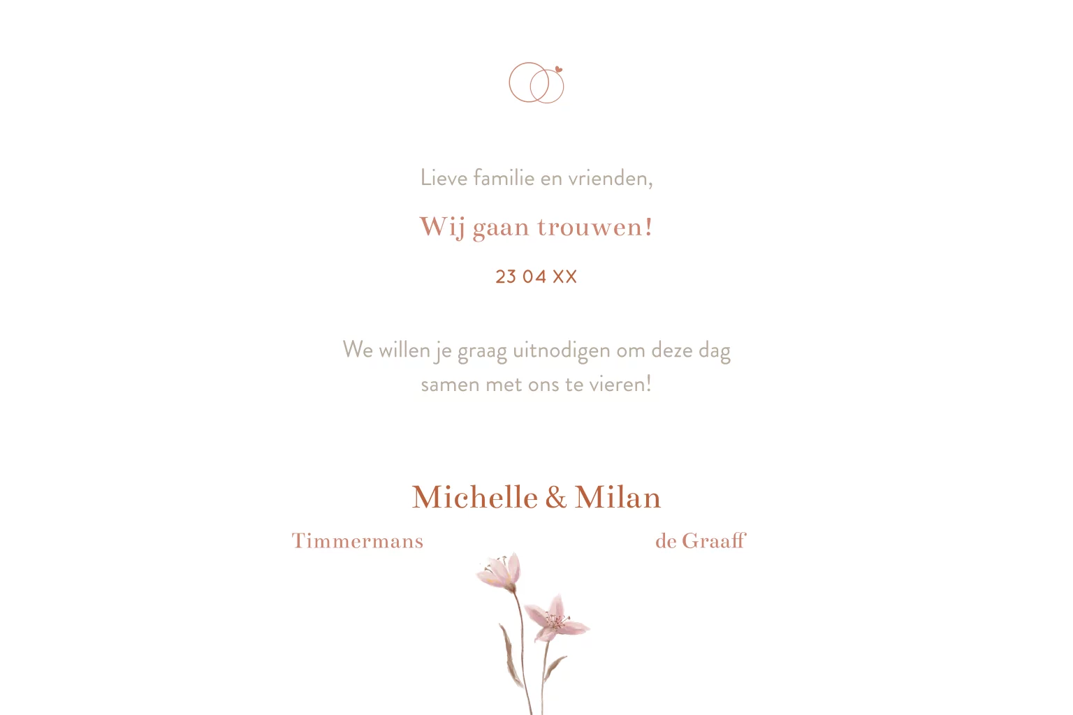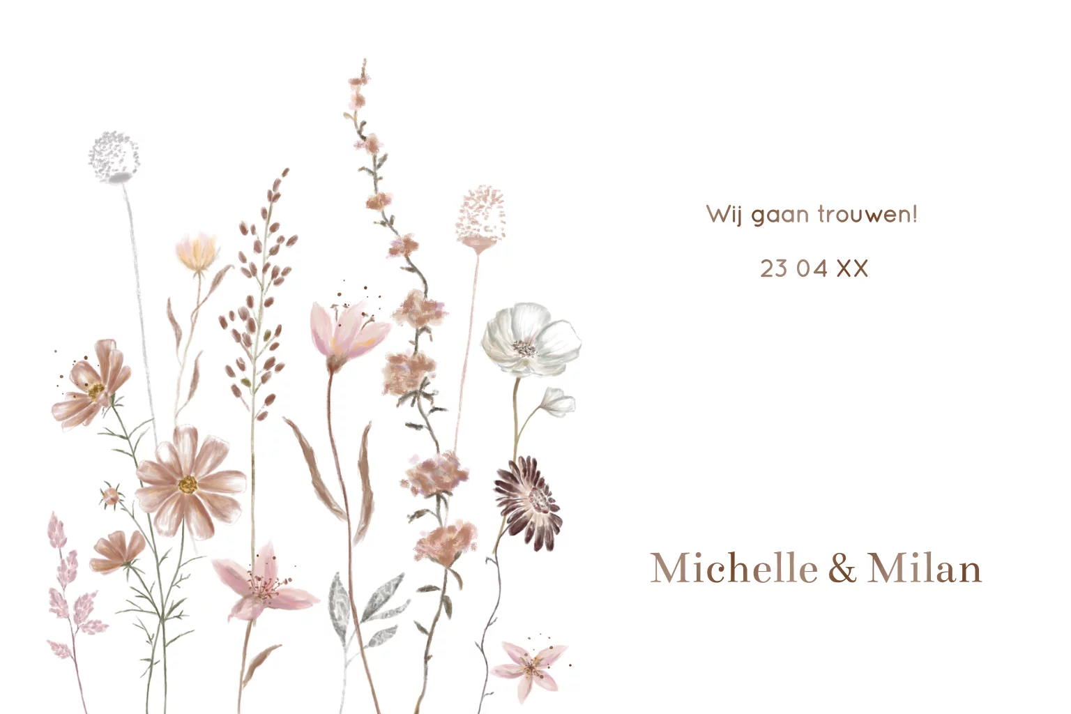 Een dubbele liggende trouwkaart met geschilderde bloemetjes in zachte kleuren, de namen en teksten aan de buitenzijden zijn in hoogglans gedrukt.
