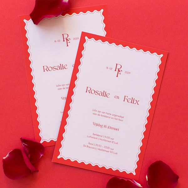 Hippe trouwkaart in roze en rood colourblock met een gegolfde rand. De tekst staat in verschillende lettertypes en is eenvoudig zelf aan te passen in de online editor.