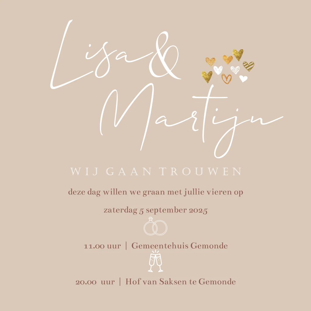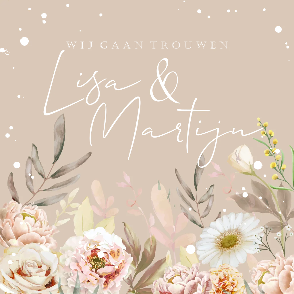 Een prachtige trouwuitnodiging met sierlijke goudfolie teksten. De trouwkaart wordt verder opgevuld met prachtige bloemen in zacht roze kleuren.