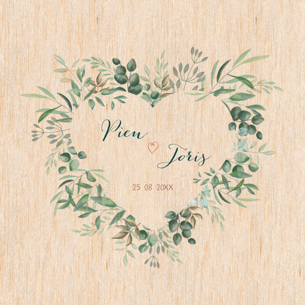 Unieke huwelijksuitnodiging op echt hout! Deze trouwkaart heeft handgetekende bloemen en blaadjes in groen en roze tinten in de vorm van een hart op de voorkant. In de editor kun je de tekst naar wens aanpassen.