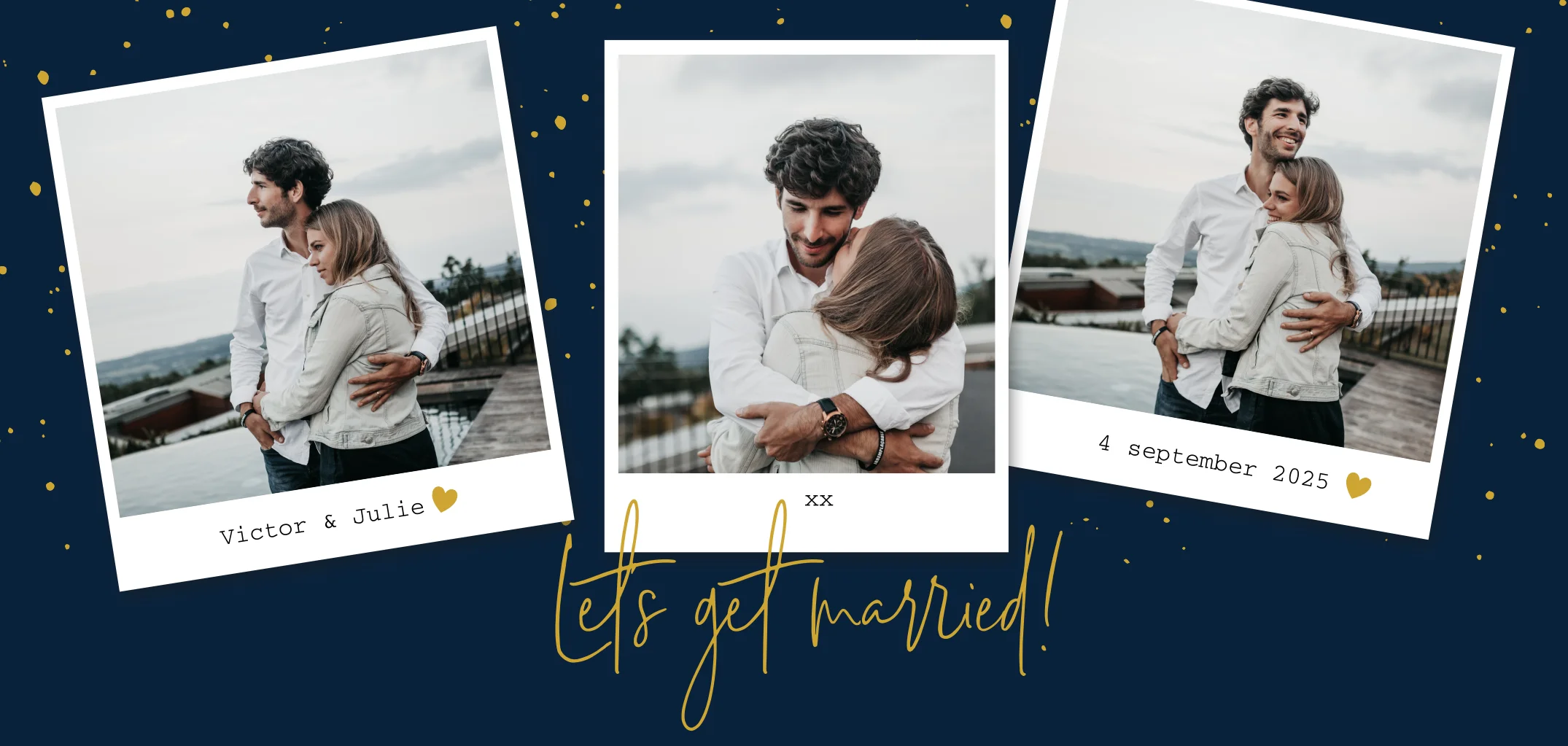 Hippe trouwkaart in donkerblauw met ruimte voor een fotocollage op de voorkant. De goudkleurige tekst staat in trendy letters en de goudspetters geven een feestelijke touch. Op de achterzijde is ruimte voor nog een foto. Upload jullie mooiste foto's en voeg eigen tekst toe in de online editor en maak de kaart zo persoonlijk naar eigen wens, een unieke uitnodiging voor een unieke dag!