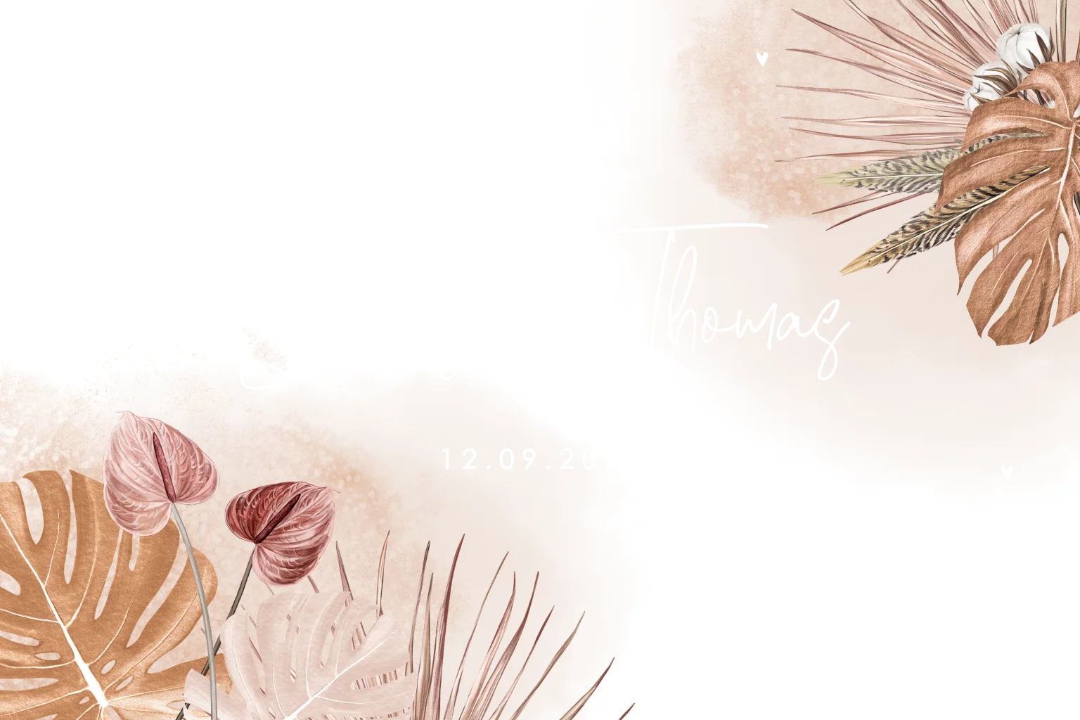 Stijlvolle trouwkaart met bloemen, bladeren in aquarel en details van roségoudfolie. Het ontwerp is naar eigen wens aan te passen in de editor.