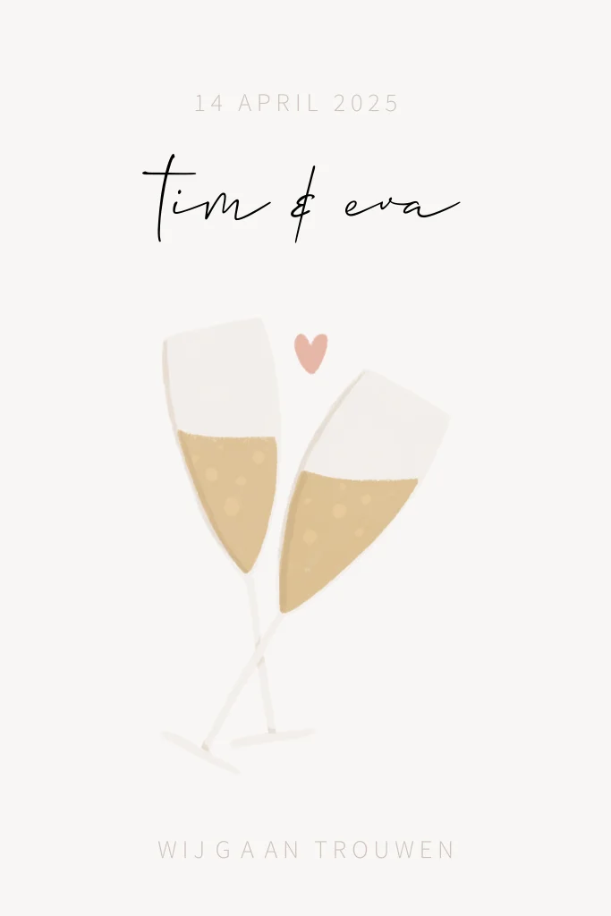 Deze hippe trouwkaart heeft een illustratie van champagneglazen en een hartje. Deze tekening komt ook weer terug aan de binnenzijde. De tekst staat in trendy letters, liever een ander lettertype? Dit kun je zelf eenvoudig aanpassen in de online editor.