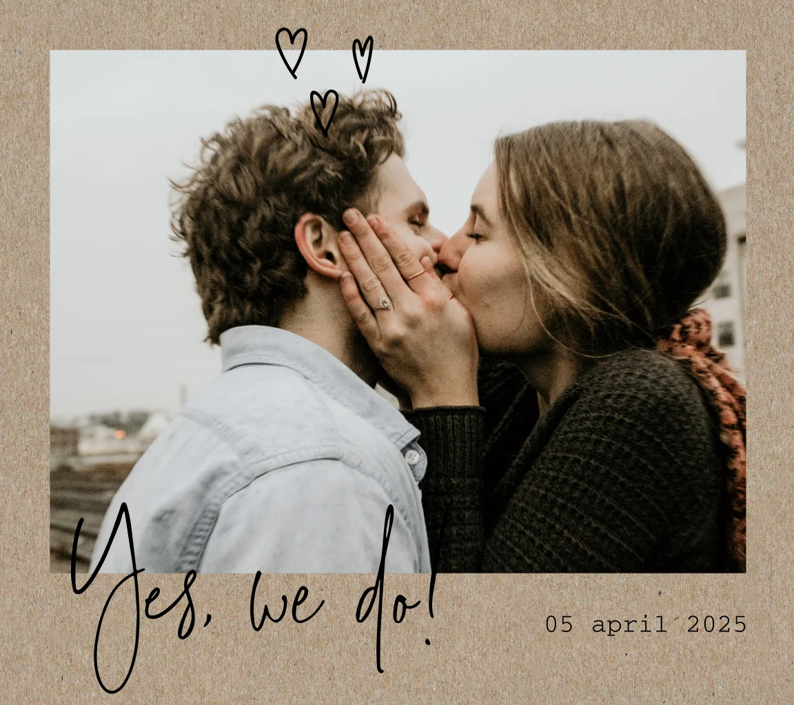 Trouwkaart op kraft-look, vierkant met afgeronde hoeken en een foto in polaroid-stijl met hartjes ernaast.