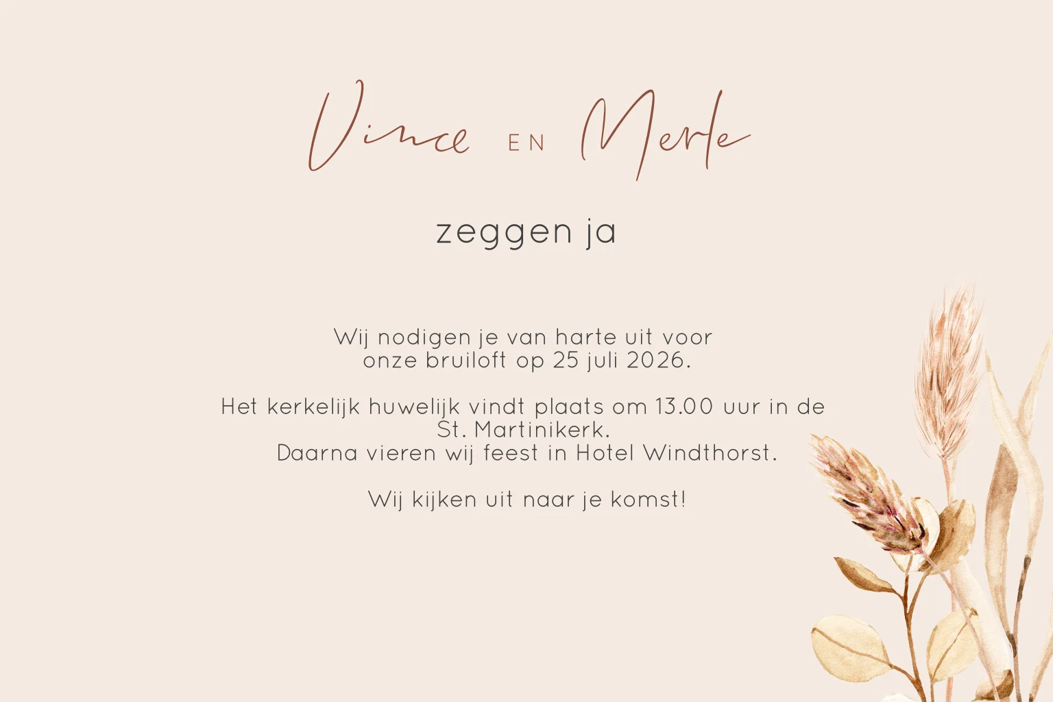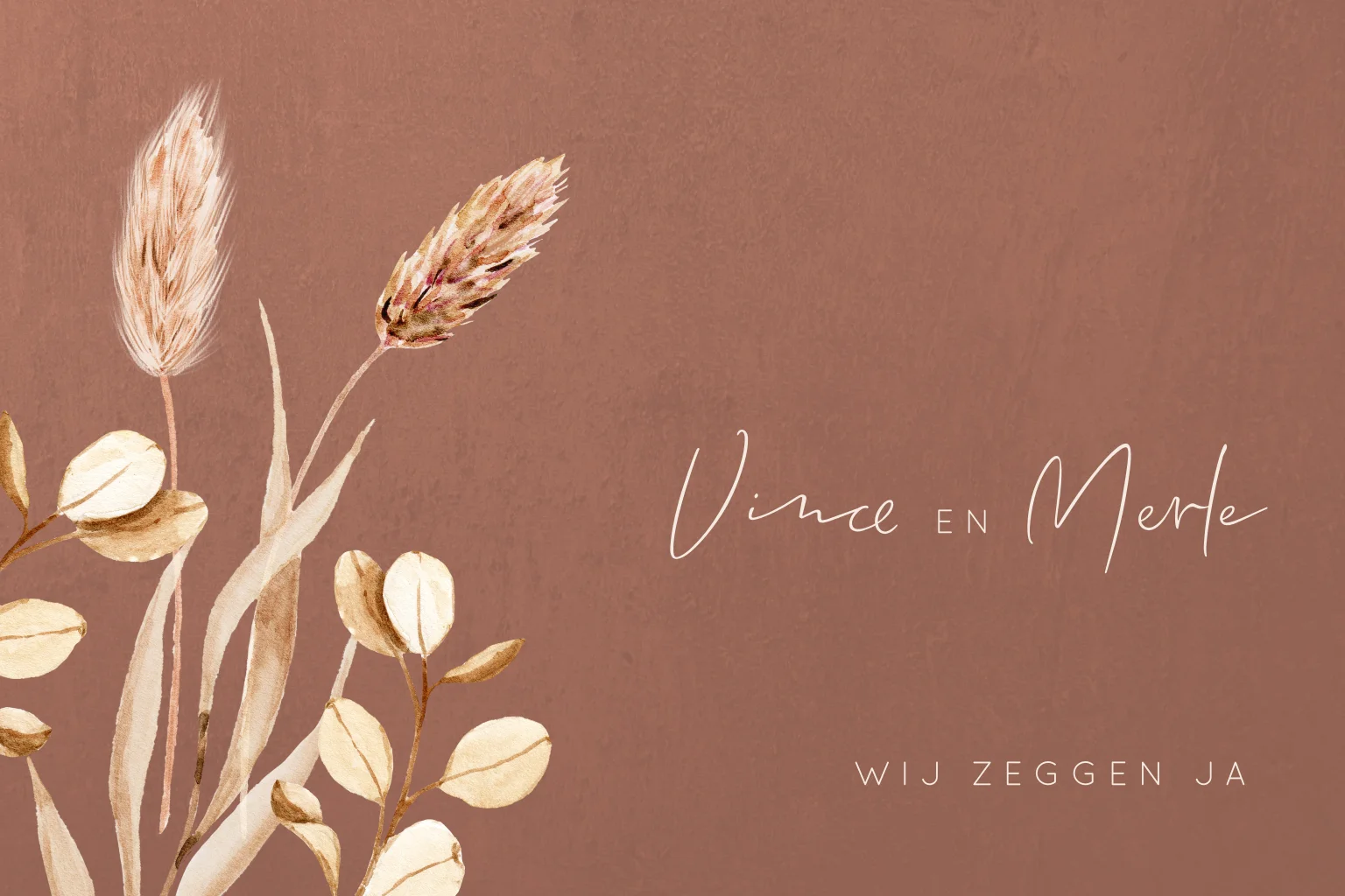 Een stijlvolle trouwkaart met een bruine achtergrond en prachtige droogbloemen. De naam van jullie beide staan in sierlijke letters geschreven. Pas de trouwkaart naar jullie eigen wensen aan in de online editor.