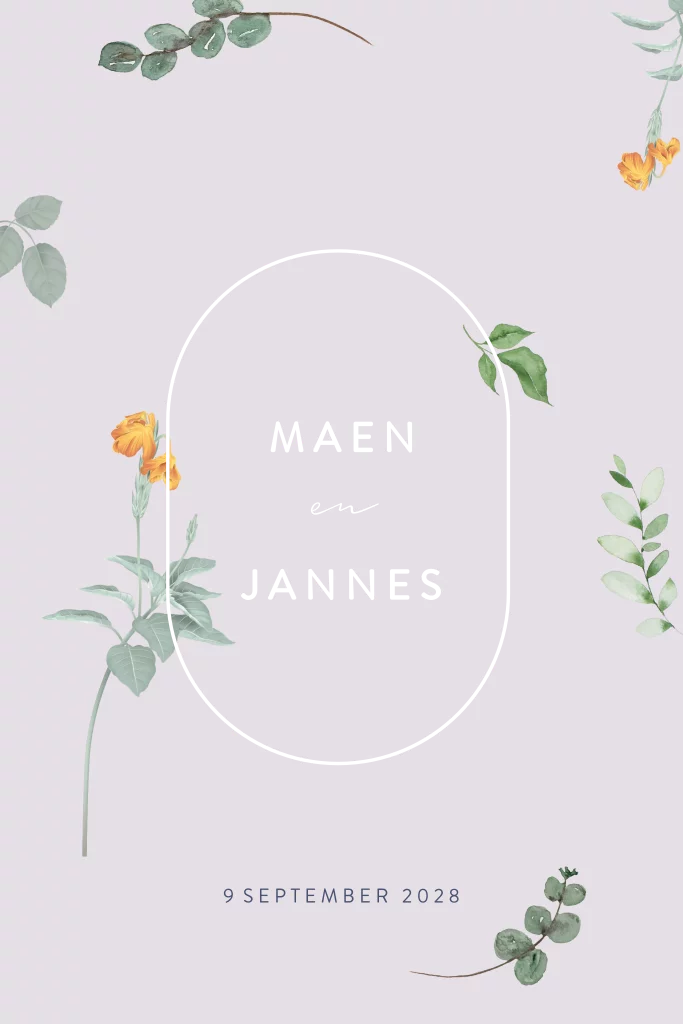 Vrolijke trouwkaart met een lila achtergrond met groene takjes en gele bloemetjes. De namen staan in een ovaal in goudfoliedruk, dat zorgt voor een luxe effect. Aan de achterzijde staat ook een bloem boven de tekst in paars.