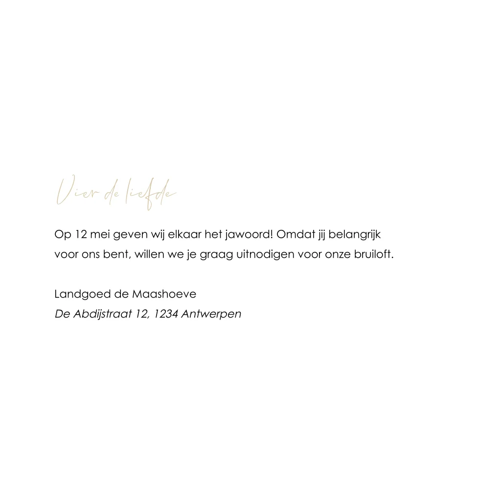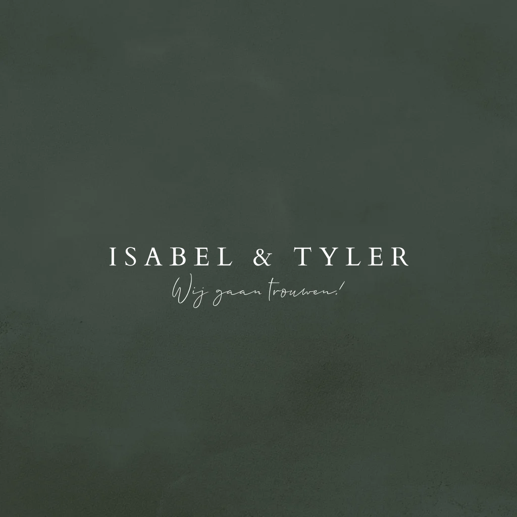 Prachtige trouwkaart met een velvet-look achtergond in donkergroen. De namen van jullie beiden staan in goudfolie gedrukt, dit geeft een luxe uitstraling.