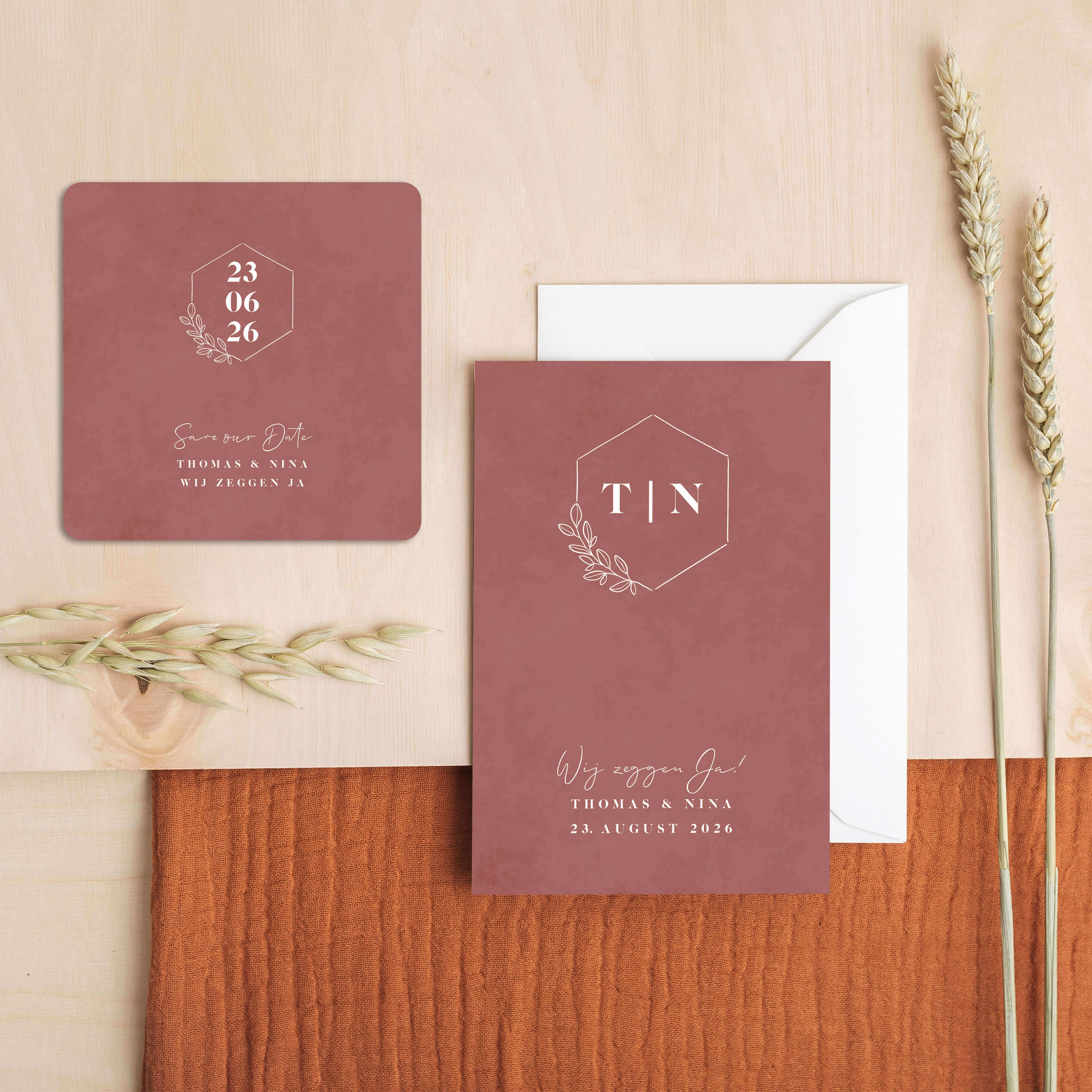 Een minimalistische trouwkaart met een moderne en stijlvolle uitstraling. Voorop de kaart staat een hexagoontje met speels takje en jullie twee beginletters. De achtergrond van de kaart heeft een bruin-roze velvet-look.