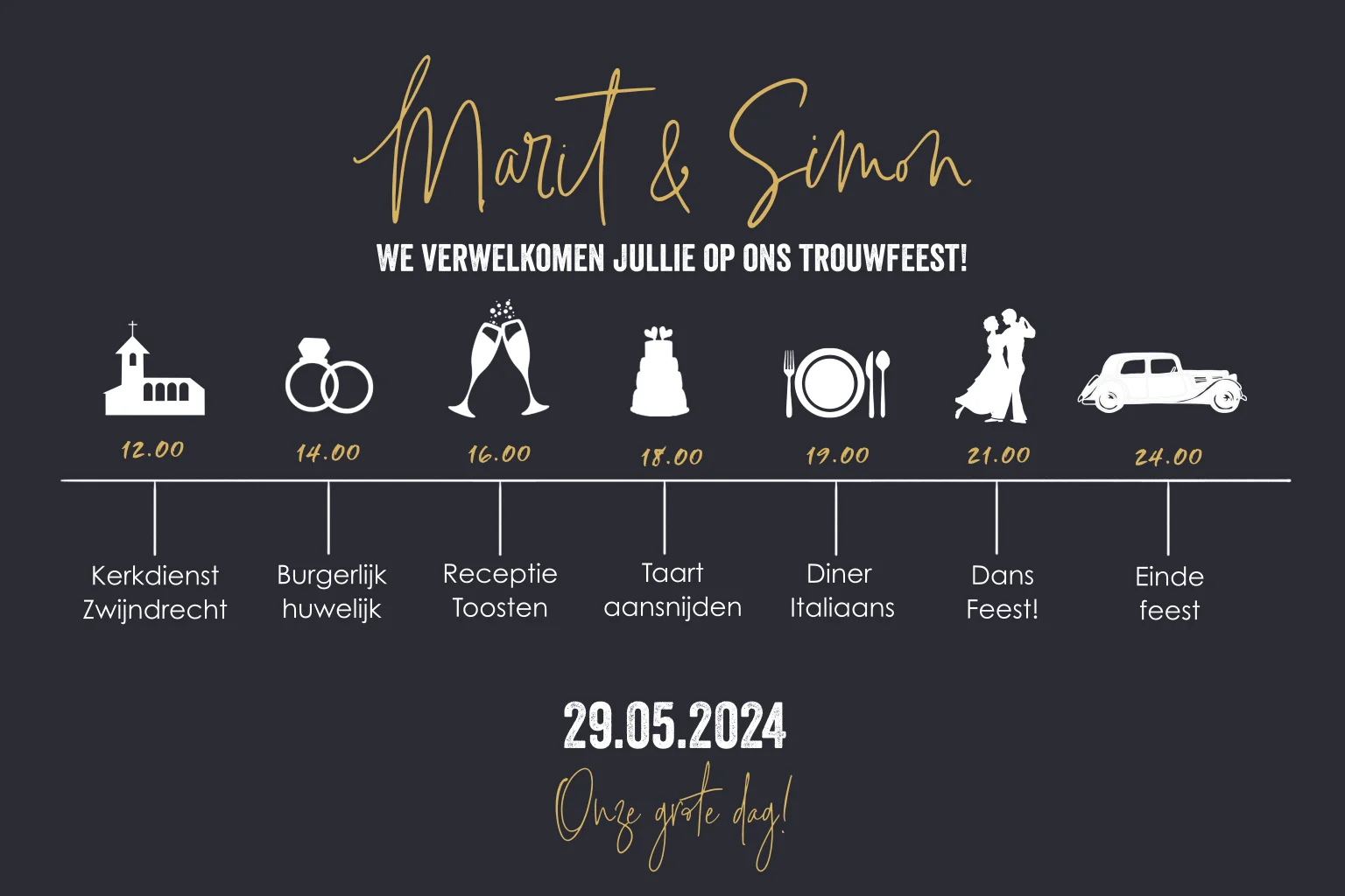 Deze moderne bruiloftsuitnodiging heeft op de voorkant een tijdlijn met witte icoontjes en sierlijke gouden letters die je zelf kunt aanpassen in de online editor. Op de achterkant is ook ruimte voor eigen tekst.